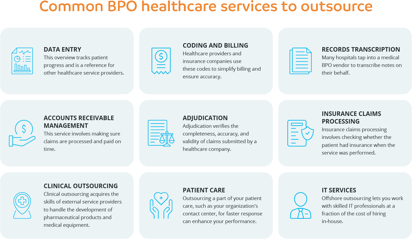 • Better patient care: nothing matters more in healthcare than the wellbeing of patients and outsourcing allows health services to keep that top of mind. With repetitive and time-consuming tasks such as claims processing and medical transcription handled by external providers, clinical staff can spend more time caring for patients and improving outcomes.